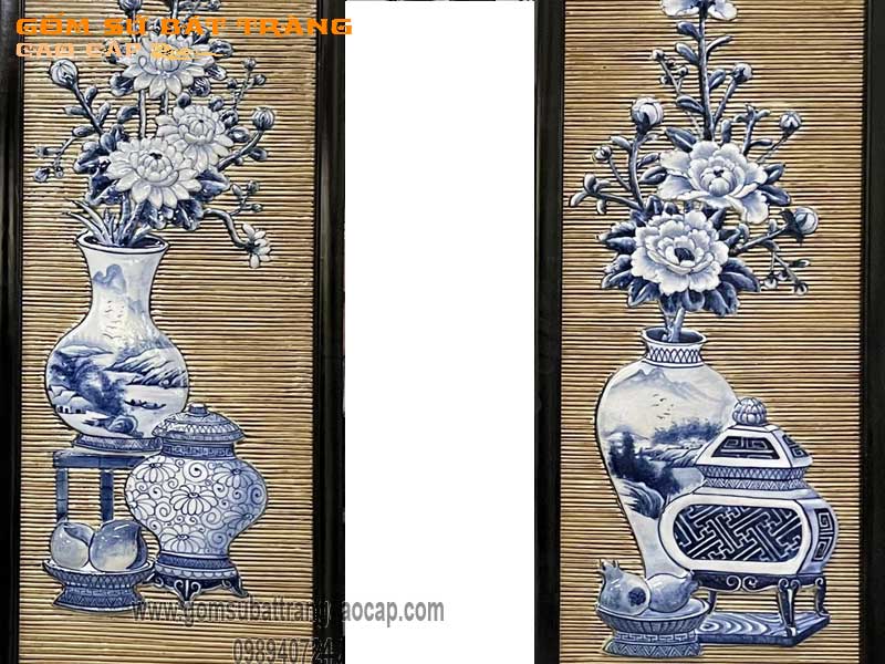 Bộ tranh tứ quý vẽ trơn kỹ 50x100cm-Khung gỗ hoa văn đen- Gốm sứ Bát Tràng