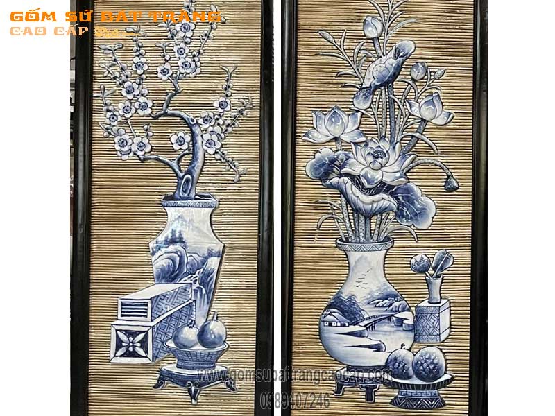 Bộ tranh tứ quý cổ đồ đắp nổi nền mành men chàm cổ-Mai Sen Cúc Mẫu Đơn- đắp nổi kỹ-50x100cm- Gốm sứ Bát Tràng