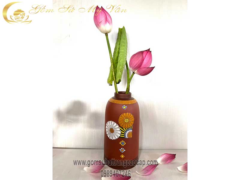 Lọ gốm dáng Chuông họa tiết thổ cẩm và hoa cúc vàng cách điệu.